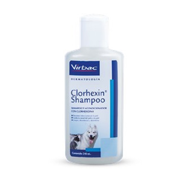 Shampoo con Clorhexidina Contiene clorhexidina, sustancia considerada como uno de los mejores antisépticos para el pelo y la piel. Limpia y desinfecta profundamente, da brillo, desodoriza y restaura la condición del pelo y la piel en caninos, felinos y equinos.