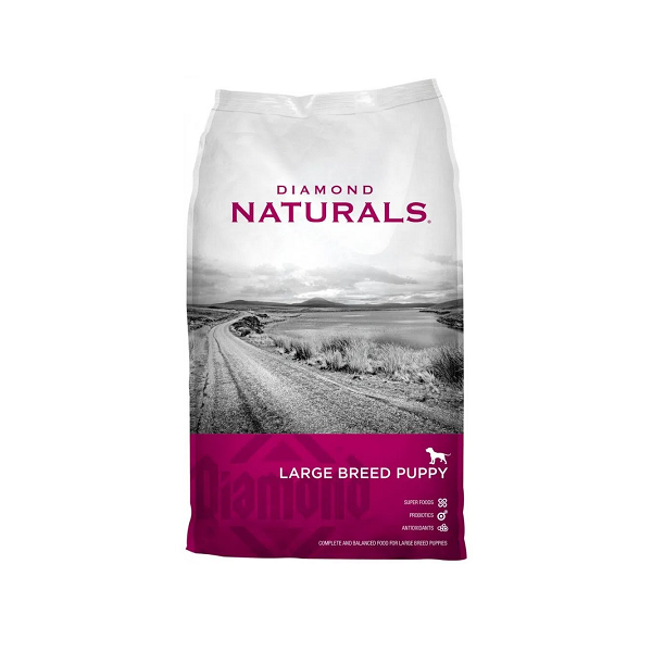 Diamond Naturals Cachorros Raza Grande Su fórmula contiene DHA para fomentar el desarrollo de su actividad cognitiva y niveles adecuados de calcio y fósforo para proteger las articulaciones y los huesos. Es un alimento para perros con sabor a cordero, arroz y vegetales.