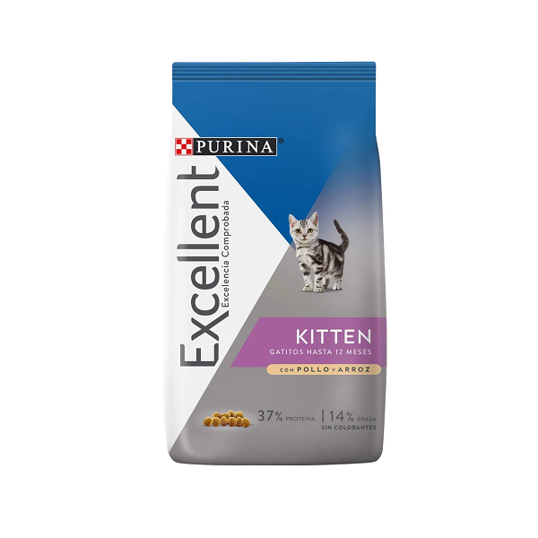 PURINA® Excellent® Gatitos Pollo y Arroz Alimento que favorece el desarrollo y crecimiento de los gatitos hasta llegar a su etapa adulta. Contiene una formula completa y balanceada a base de proteínas de alta digestibilidad, equilibrada con calcio, fósforo y con ácidos grasos Omega 3 y 6.