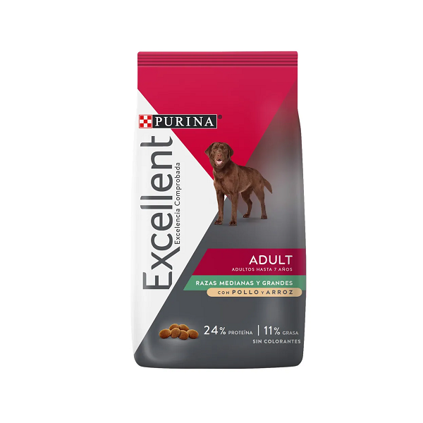 PURINA® Excellent ® Adultos Pollo y Arroz Razas Medianas y Grandes Los perros adultos tienen diferentes necesidades nutricionales que los cachorros o los perros maduros. Excellent ofrece una fórmula completa que incluye aminoácidos esenciales, inulina, vitaminas, minerales y zeolita, aportando un óptimo balance nutricional y un sabor irresistible