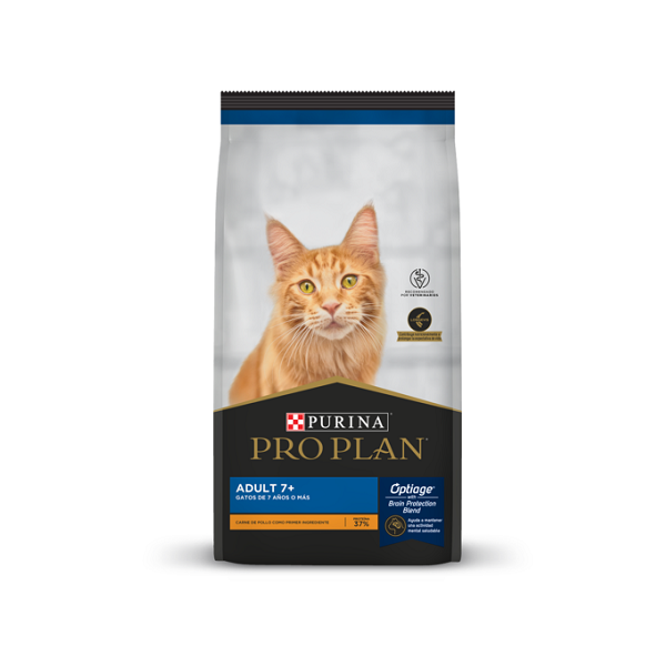 Purina ProPlan Alimento seco Gato Adulto 7+ Es un alimento Super Premium para gatos adultos a partir de los 7 años de edad. La exclusiva fórmula OptiAge®, contiene una mezcla de aminoácidos y antioxidantes naturales que ayudan a mantener la actividad cerebral y retrasar sus signos de envejecimiento.