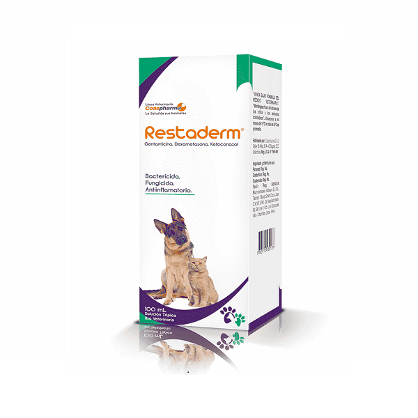 Restaderm Indicado para infecciones cutáneas en bovinos, equinos, caninos y felinos. Es una solución antibacterial, fungicida y antiinflamatoria. Para uso tópico únicamente . Distribuya el producto sobre el área afectada asegurando un buen contacto. Realice dos aplicaciones al día durante 7 días o hasta la desaparición de los síntomas.
